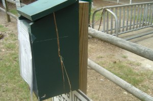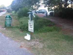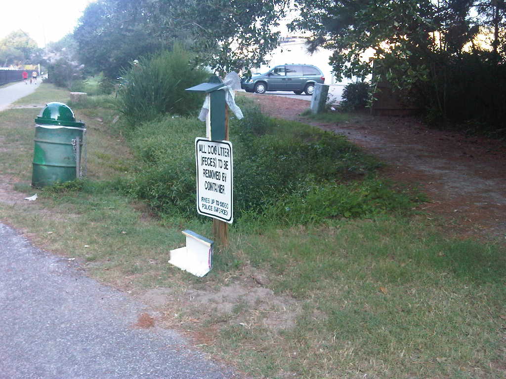Two doggie bag dispensers on the bike path were damaged sometime last night. The one near Hatton St. was broken off the post and destroyed and the one near Bayberry St. was split down the entire side. Attached are pictures of the damage. It is too bad that certain individuals have not been taught to respect the property of others. The City will be notified for repairs.