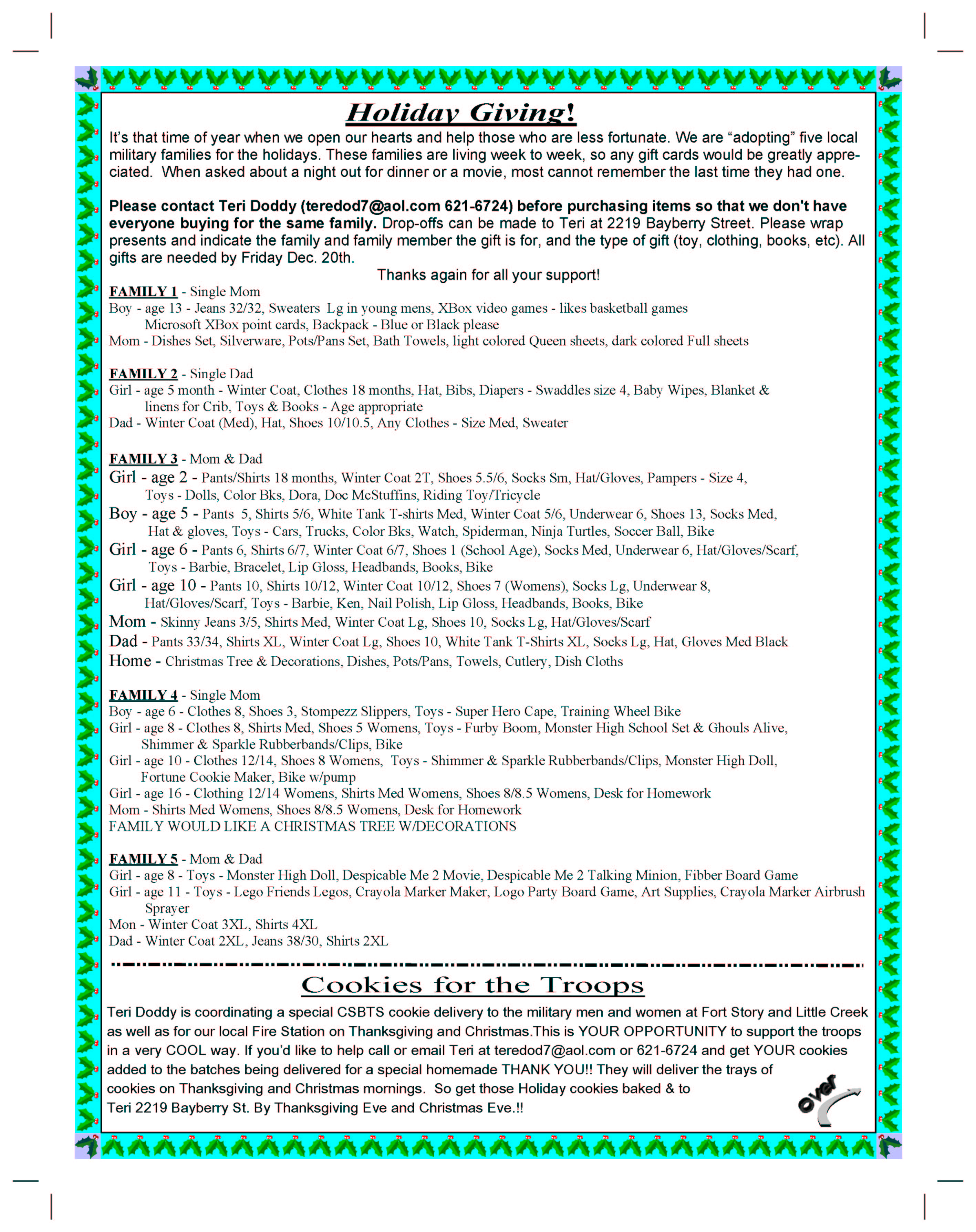 Cape Story Holiday Giving – Items due by Dec. 20th Posted on December 3, 2013 by Todd Solomon Help local soldiers and their families. Click here for a printable version of the flyer. Holiday Giving Flyer 2013 Share this: Click to share on Facebook (Opens in new window) Facebook Click to share on X (Opens in new window) X Like Loading... Related