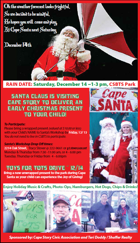 ***Cape Santa Event Rescheduled to Sat. Dec. 14th*** Posted on December 6, 2013 by Todd Solomon Click here for a printable version of the flyer CAPE_SANTA_RAINDATE Share this: Click to share on Facebook (Opens in new window) Facebook Click to share on X (Opens in new window) X Like Loading... Related