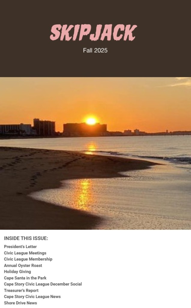 Fall 2025 Skipjack Newsletter Posted on December 7, 2025 by Todd Solomon Thank you to our amazing newsletter editor Chris Cahoon for another wonderful edition. Please click on the image link below to read our digital newsletter full of information about our wonderful neighborhood. Share this: Click to share on Facebook (Opens in new window) Facebook Click to share on X (Opens in new window) X Like Loading... Related