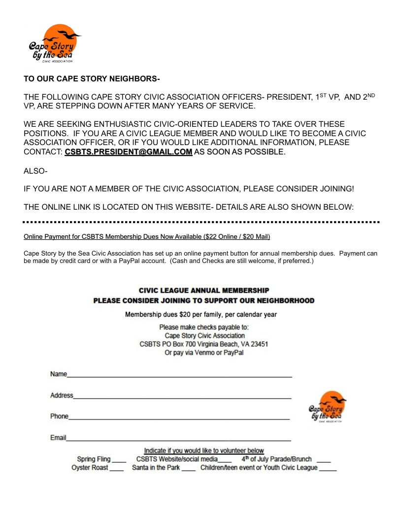 If you’d like to join the Civic Association, please click on this link Online Payment for CSBTS Membership Dues Now Available ($22 Online / $20 Mail) | Cape Story by the Sea